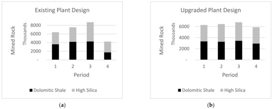 Tonnes of rock mined per period for the existing (a) and upgraded (b) designs.