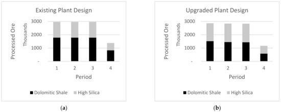 Tonnes of ore processed per period for the existing (a) and upgraded (b) designs.