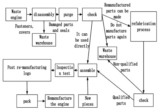 We applied the optimization model of remanufactured parts classification and selection to a domestic automobile engine remanufacturing enterprise, which has more than 100 waste engine recycling centers across the country. The recycling time and recycling location of each recycling point are different and the quality of different recycled engines is also different. A total of 80% of the remanufactured parts are used in a remanufactured engine, but the assembly success rate is only 84.41% and customer complaints are frequent. Compensation expenses were as high as CNY 9.57 million in 2019, accounting for 7.81% of sales [27,28,29,30,31,32]. Figure 2 shows the process flow chart of the company’s remanufactured engine.