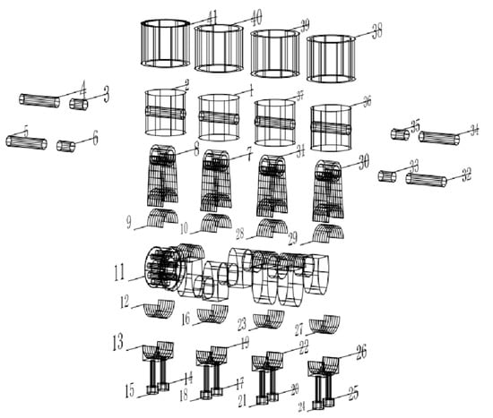 Remanufactured engine companies recycle engines from recycling stations with different quality levels. In this case, a 1.4 TGDI gasoline engine crank-connecting rod mechanism is used as an example. Figure 3 is a three-dimensional solid model of the crank-connecting rod mechanism, wherein 1, 2, 36, and 37 are pistons; 3, 6, 33, and 35 are bushings; 4, 5, 32, and 34 are piston pins; 7, 8, 30, and 31 are connecting rod bodies; 9, 10, 28, and 29 are upper half bearings; 11 are crankshafts; 12, 16, 23, and 27 are lower half bearings; 13, 19, 22, and 26 are connecting rod covers; 14, 15, 17, 18, 20, 21, 24, and 15 are connecting rod bolts; 38, 39, 40, and 41 are cylinders.