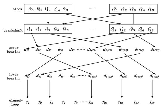Coding the engine block and crankshaft, it can be seen in Table 2 and Table 3 that the cylinder block code 1-03 first neck, the crankshaft code 2-02 first neck, and the crankshaft code 2-03 s neck size do not meet the standard of the new part size. This can result in scrap or rework during assembly. The 1.4 TGDI remanufactured engine crank assembly closed-ring constraints are the same as new assembly constraints. The cylinder block of the engine is matched with the crankshaft during assembly; through the calculation results of arrangement and combination, a total of 120 combination schemes can be obtained. The cylinder block and the crankshaft are regarded as a whole. When selecting the upper and lower bearing shells, the commonly used greedy algorithm is used [33,34,35,36]. The bearing bush, the lower bearing bush, and 120 kinds of combinations are optimized one by one, so as to complete the optimization of an assembly scheme. The structure diagram of the matching process after optimization is shown in Figure 4.