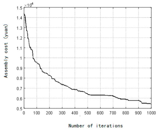 Based on the above optimized crank assembly selection scheme, the relevant programs of the remanufactured engine crank-connecting rod mechanism classification selection model are written in Matlab. The reused parts, re-repaired parts, and new parts of each assembly part were coded, and the types of parts in the assembly process were coded according to the assembly sequence. According to the assembly constraints and the classification scheme selection, the particle swarm genetic combination algorithm proposed in this study was used to optimize the model. The specific combination algorithm parameters were set as follows: the initial population size was 50; the maximum number of iterations was 1000; the cross factor was set to 0.9; the variation factor was set to 0.4; the learning factor was ; and Matlab was used to optimize the simulation. The operation results are shown in Figure 5.