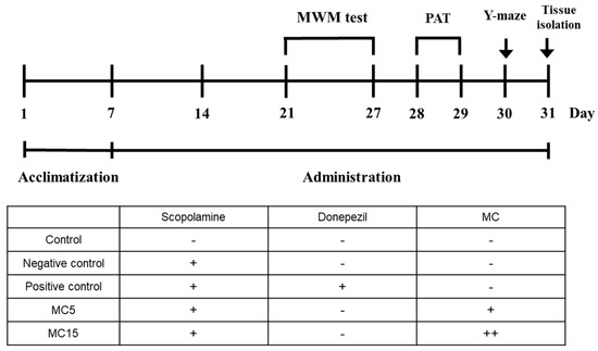 After acclimatization of the mice for 1 week, scopolamine was treated to the end of 31st day for negative control, and the donepezil and MC were also administered for positive control and dosed groups, respectively. Animal behavioral experiments of MWM, PAT, and Y-maze were performed for 7, 2, and 1 day(s), respectively, after the drug treatments for two weeks. After the completion of animal behavioral experiments, the mice were sacrificed, and hippocampus tissues were isolated (Figure 1).