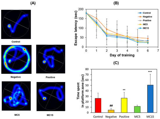 Figure 2. Recovery of long-term memory by MC on MWM test. (A) Swimming paths; (B) Escape latency for 6 consecutive days; (C) Time spent in platform zone in which the platform was removed. Data are presented as mean ± SEM. ## p < 0.01, compared to the control group; ** p < 0.01 and *** p < 0.001, compared to the scopolamine-treated group (n = 8).