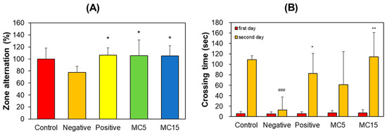 The scopolamine-treated group showed a decrease in correct zone alternation in the Y-maze teat; however, MC5 and MC15 showed restored values in zone alternation to the level of the donepezil-treated group (Figure 3A). In PAT, the crossing times of all five groups on the first day were low and very similar to each other. However, that of the control on the second day increased to 109 s, but that of the scopolamine-treated negative control decreased to 13 s. Effectively, MC5 and MC15 showed restored crossing times to the level of the donepezil-treated positive control (Figure 3B). In addition, the recovery degrees of MC5 and MC15 were concentration-dependent (Figure 3B).