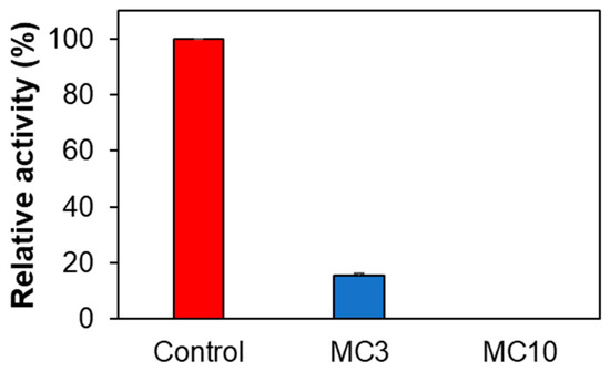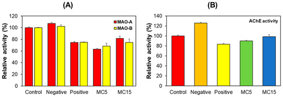When SH-SY5Y cells were treated with low concentrations of MC (i.e., MC3), AChE activity was significantly reduced to 15.5%, and when it was treated with high concentrations of MC (i.e., MC10), AChE activity was not detected (Figure 5). These results suggested that MC could inhibit AChE in SH-SY5Y cells, although it weakly inhibited AChE in enzyme and inhibitor assay (19.4% inhibition at 10 µM of MC) [36]. MAO-A and MAO-B activities for control, MC3, and MC10 were not detected in SH-SY5Y cells.