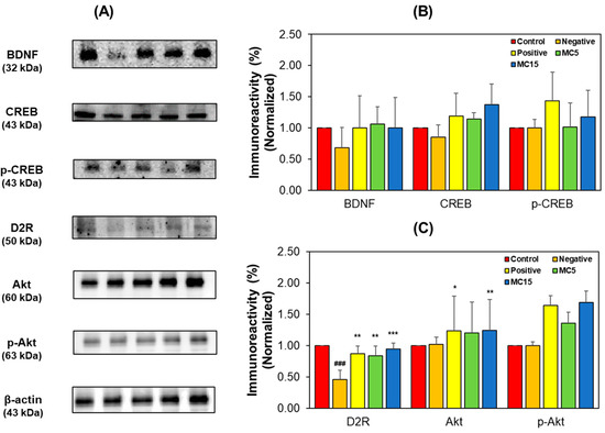 The proteins were separated using 11% SDS polyacrylamide gels and transferred to nitrocellulose membranes. The membranes were blocked in TBS-T containing 5% skim milk for 2 h at room temperature and attached at 4 °C overnight with the primary antibodies as follows: CREB (#701120, 1:2500), p-CREB (#44-298G, 1:1000), BDNF (#MA5-31039, 1:500), Akt (#4691, 1:1000), p-Akt (#4060, 1:2000), D2R (D2R-212AP, 1:1000), and beta-actin (#PA1-183, 1:500). The membrane with the primary antibody was mixed with the horseradish-peroxidase-conjugated goat anti-rabbit IgG (H+L) secondary antibody (#31460, 1:10,000) for 1 h at room temperature [50]. The membrane was detected using MicroChemi 4.2 (DNR Bio-Imaging Systems Ltd., Neve Yamin, Israel) with the chemiluminescence solution.