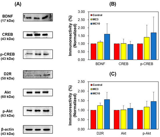 In Western blotting, MC increased BDNF and D2R expression levels as well as the phosphorylation of CREB and/or Akt proteins. This increased BDNF expression was similar to the observation in other studies previously reported [44,47]. From these results, it can be proposed that the signaling pathways proceed via Akt and CREB proteins (Figure 8). Increased BDNF expressions have been observed when various chemicals or extracts were treated [49,60]. D2R is the main receptor for most antipsychotic drugs and is associated with Akt and GSK-3 signaling [14]. In this study, levels of BDNF and D2R increased with MC administration, and these results suggest that MC can be used for the treatments of AD and PD through cognitive function improvement and dopamine receptor expression.