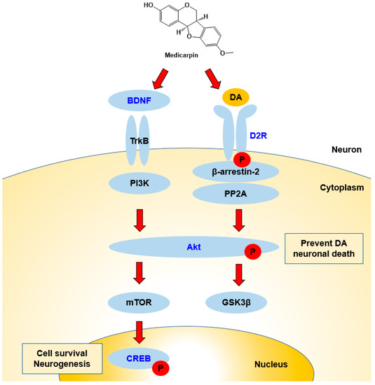 Figure 8. Possible responses of BDNF/Akt/CREB and D2R signaling pathways during interactions with MC. BDNF activates Akt, and next, Akt activates CREB, which is related to cell survival and neurogenesis. D2R activates the Akt–GSK3 pathway, and the activation of Akt prevents DA neuronal death. Names in blue color represent the factors tested in this study.