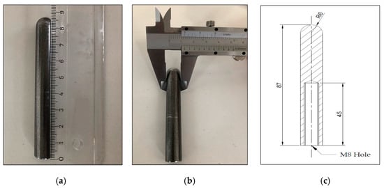 A multi-point forming die set with 7 × 7 matrices was constructed to perform experimental studies. All components of die set material were selected as AISI 4140 steel due to its mechanical properties []. A photo of the die set and constructed bottom die is shown in Figure 1. Pins were connected to plates with M8 grade 10.8 bolts to arrange the pin height as well as the die-forming shape. Additionally, plates had M8 holes and each hole was located at a distance of 15 mm away from the other. In the experimental study, a pin with a 12 mm diameter and 87 mm length was utilized to form three different forms and to verify the finite element simulations, as shown in Figure 2. The pin also has a 45 mm length of internal M8 thread, and its tip was rounded with a radius of 6 mm.