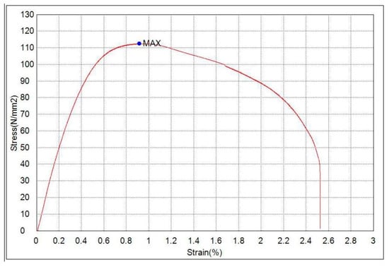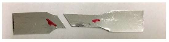 Tensile tests were conducted on sheet metal with ASTM E8 standard using a Shimadzu AG-X machine manufactured in Shimadzu Corporation, Tokyo, Japan with a 1 mm/min test speed on dog-bone-shaped specimens. Test results are shown in Figure 3. A yield strength of approximately 75 MPa and a tensile strength of 112 MPa were acquired from tests. The specimen after the tensile test is shown in Figure 4.