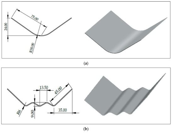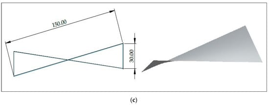The final shape of the sheet parts was obtained from a 150 × 150 mm sheet blank. Form1 was a V-type part, form2 was a wavy shape, and form3 was a 3D free-form surface. The technical drawings of the three forms are shown in Figure 5.