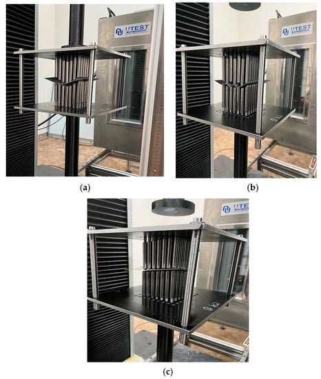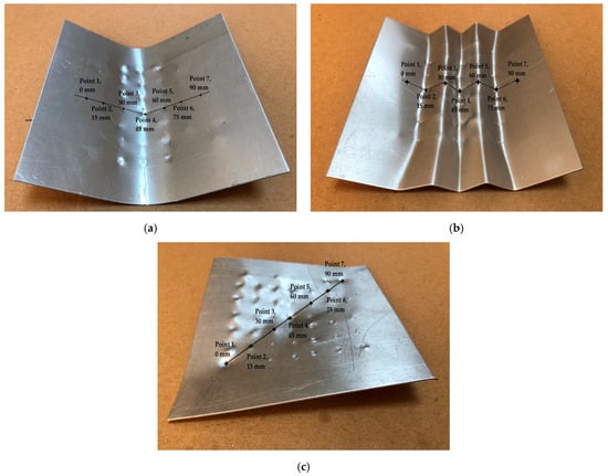 A Utest universal testing machine with a 20 kN maximum load capacity was used as the press source. The press head moved at a 1 mm/min stroke rate to form sheet metal at room temperature. SEA 40 oil was also utilized at the contact between the sheet and the pins for lubrication. In every 1 mm stroke, the load was acquired from the testing machine. The photos of the sheets during forming for forms1–3 are shown in Figure 6. The geometry of the forming areas of the die set was achieved by adjusting the pin height individually. Firstly, the forming area of the sheet metal was divided into 7 × 7 matrices, and then the necessary heights of pins were calculated from CAD data with Solidworks Premium 2018 ver. SP 0.0 software.
