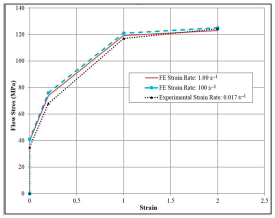 A finite element model was developed using DEFORM-3D Ver 6.1 to investigate the pin diameter effect of formations. Each model was constructed with pins of 10, 12, and 14 mm diameters. To reduce the computing time in simulations, pins and plates were modeled as rigid bodies, as a consequence the material was not attached and the mesh was not created for rigid bodies in DEFORM-3D. The workpiece material was modeled as elastoplastic material. The DEFORM-3D database includes elastoplastic material properties of AL 1100 for cold forming. The consistency was shown between the flow stress–strain curve of Al 1100 in the database and the calculated flow stress–strain curve after conducting the tensile test, as shown in Figure 7.