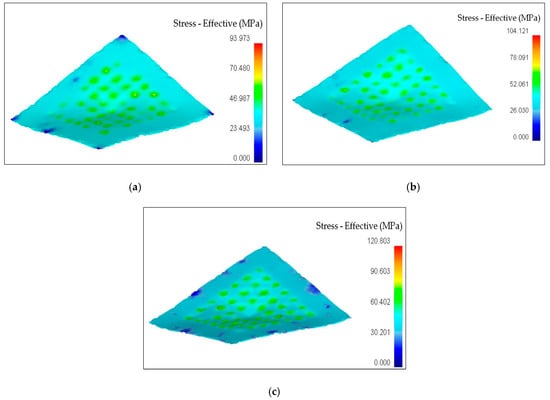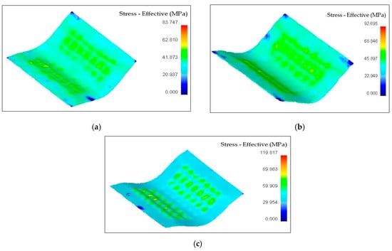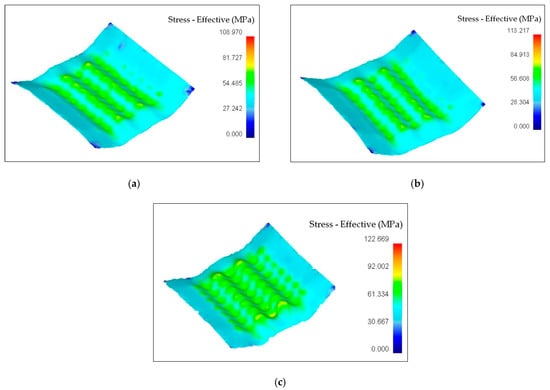 Form3 has a 3D free-form surface, therefore it has one more forming dimension than form1 and form2 which have required two-dimensional forming. MPF forming is a very flexible method for 3D parts as mentioned in the literature [,,,,]. The stress distribution for form3 is shown in Figure 10. The maximum effective stresses were calculated as 93.973 MPa, 104.121 MPa, and 120.803 MPa for the pin diameters of 10, 12, and 14 mm, respectively. Additionally, the 14 mm diameter pin showed 22.2% and 13.8% higher stress than the 10 mm and 12 mm diameter pins, respectively.