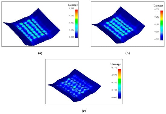 Damage factors of form3 with (a) 10 mm pins; (b) 12 mm pins; (c) 14 mm pins.