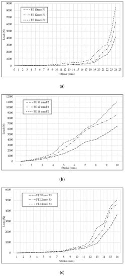 Forming load–stroke graphs from numerical simulations of (a) form1; (b) form2; (c) form3.