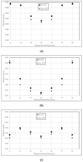 Comparison of thicknesses between simulations and experiments (a) form1; (b) form2; (c) form3.