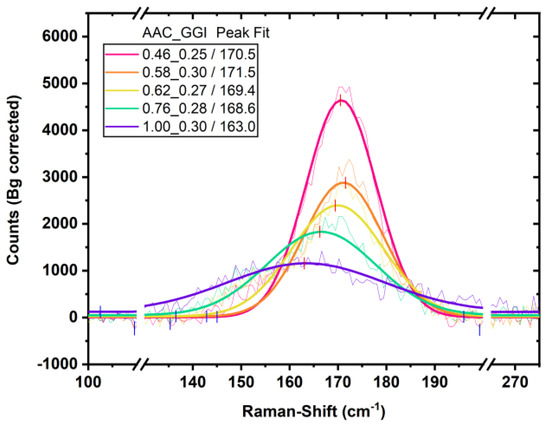 Figure 3 shows the background-corrected and baseline-subtracted main Raman signal of ACIGSe with various Ag contents and GGI around 0.3. The peak values determined by Gaussian fitting are also indicated in the legend. The general trend of decreasing Raman shift with increasing Ag content is clearly confirmed. Here the values lie between 163 cm