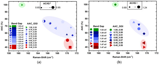 –0.59). The ratio of AC/IG is also considered in the plots and represented by varying sizes of the symbols. Generally, the trend of decreasing Raman shift with increasing AAC can be confirmed. Furthermore, three groups of band gaps can be separated along with AAC content: 1.27 eV, [1.37,1.43] eV, and 1.58 eV for low GGI and 1.47 eV, [1.48,1.54] eV and 1.63 eV for high GGI. Between the groups, a partial overlap of the Raman peak position occurs. The origin may be found in the difference in AC/IG. Consequently, samples from the red group with AC/IG up to 0.95 or 1.24 (