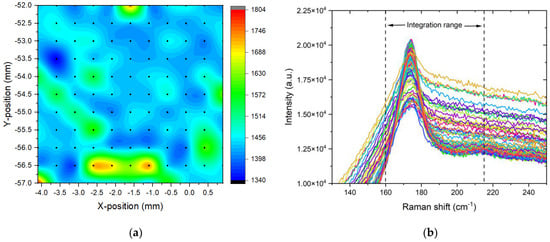 Figure 5a). The shown map spans an area of 5 mm x 5 mm with a Raman spectrum recorded every 0.5 mm. The Raman raw signal integrated around the A