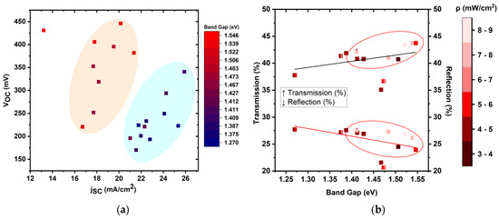 Figure 8a, two groups become visible: samples with band gaps between 1.27 and 1.43 eV and those with