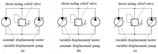 The volumetric speed-control circuit with variable/constant displacement pump/motor. (a) VDP—CDM, (b) CDP—VDM, (c) VDP—VDM.
