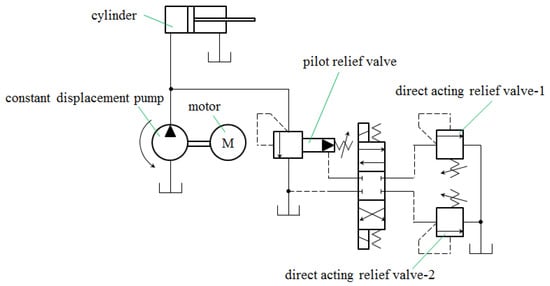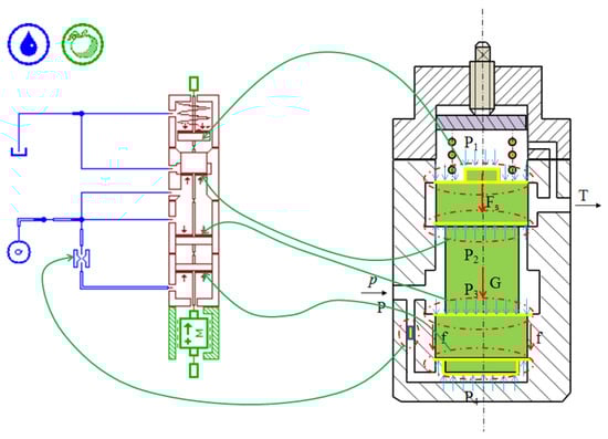It can be seen from Figure 8 that , ; therefore, the values of and are equal and opposite, which can offset each other. In addition, since is connected to port , and . According to the above analysis, the resultant force of hydraulic forces acting on the valve element 3 is . As long as is satisfied, the valve port can be opened and the oil overflows to the oil tank.