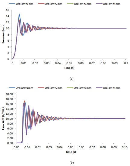 The pressure response characteristics with orifice diameters of 1 mm~4 mm are shown in Figure 10a. The final stable value of the pressure is 10.02 bar. When the orifice diameters are 1 mm, 2 mm, 3 mm and 4 mm, the maximum pressure overshoot is about 4.608 bar, 2.712 bar, 2.353 bar and 2.26 bar, respectively. When the orifice’s diameter is 1 mm, the oscillation frequency is the lowest, about 167 Hz. When the orifice’s diameter is 2 mm, the oscillation frequency is about 200 Hz. When the orifice’s diameter is 3 mm and 4 mm, the oscillation frequency is close to about 250 Hz. In addition, when the orifice’s diameter is 1 mm, 2 mm, 3 mm and 4 mm, it needs to oscillate to about 0.06 s before the pressure can reach the stable value.