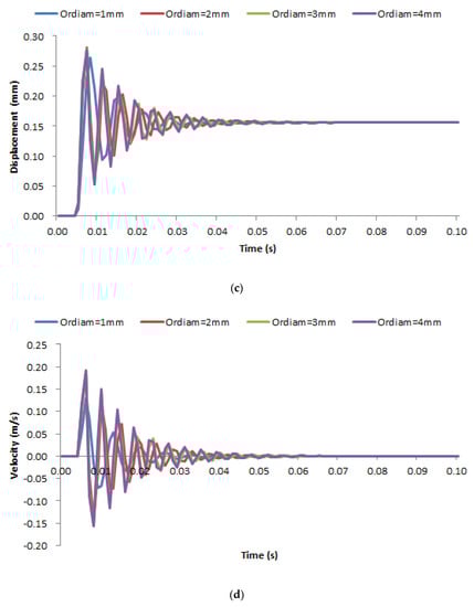 - The smaller the orifice diameter is, the smaller the oscillation frequency, amplitude and maximum overshoot of pressure, flowrate, displacement, and velocity is. When the orifice diameter is 1 mm, the oscillation frequency is the lowest, about 167 Hz. When the orifice diameter is 2 mm, the oscillation frequency is about 200 Hz. When the orifice diameter is 3 mm and 4 mm, the oscillation frequency is close to about 250 Hz. The flowrate, displacement and velocity before 0.004 s are 0, and the pressure, flowrate, displacement and velocity will oscillate to about 0.06 s to reach individual stable values.