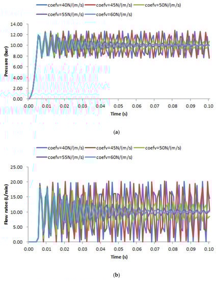 The flowrate response characteristics with the viscosity coefficient of 40 N/(m/s)~60 N/(m/s) are shown in Figure 11b. The final stable value of flowrate is 10 L/min, and the flowrate before 0.004 s is 0 L/min. When the viscosity coefficient is 40 N/(m/s) and 45 N/(m/s), the flowrate oscillates periodically, the oscillation amplitude does not decrease, about 10 L/min, and the oscillation frequency is relatively high (333 Hz). When the viscosity coefficient is 50 N/(m/s), 55 N/(m/s) and 60 N/(m/s), the flowrate oscillates periodically, but the amplitude of the oscillation gradually decreases, and the oscillation frequency is relatively low (250 Hz). In addition, it can be seen that the larger the viscosity coefficient is, the smaller the amplitude of flowrate oscillation for adjacent oscillation periods is. It can be predicted that when the viscosity coefficient is 60 N/(m/s), the flowrate will reach the stable value earlier.