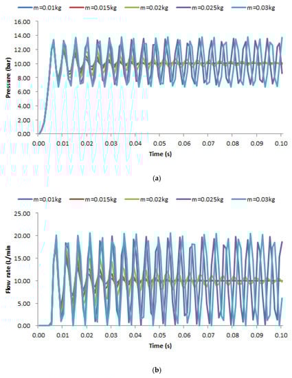 The pressure response characteristics of a valve element with a mass of 0.01 kg~0.03 kg are shown in Figure 12a. When the valve element mass is 0.025 kg and 0.03 kg, the pressure oscillates periodically and the amplitude of the oscillation does not decrease (about 3.5 bar). When the valve element mass is 0.01 kg, 0.015 kg and 0.02 kg, the pressure oscillates periodically but the amplitude of oscillation decreases gradually. In addition, it can be seen that the pressure oscillation frequency is about 200 Hz. With the increase in valve element mass, the pressure oscillation frequency will decrease, but not to a large extent. The smaller the valve element mass is, the smaller the amplitude of pressure oscillation for adjacent oscillation periods is. It can be predicted that when the valve element mass is 0.01 kg, the pressure will reach the stable value earlier.
