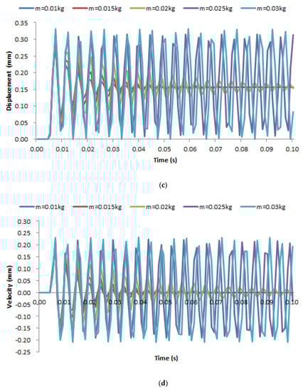 (a) The pressure response characteristics—valve element mass: 0.01~0.03 kg. (b) The flowrate response characteristics—valve element mass: 0.01~0.03 kg. (c) The displacement response characteristics—valve element mass: 0.01~0.03 kg. (d) The velocity response characteristics—valve element mass: 0.01~0.03 kg.
