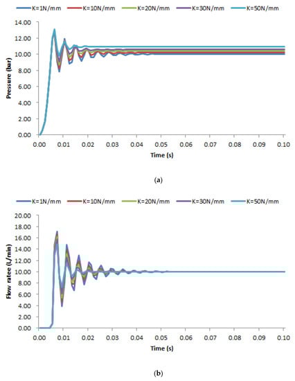 The flowrate response characteristics with a spring stiffness of 1 N/mm~50 N/mm are shown in Figure 13b. The flowrate before 0.004 s is 0 L/min, and 0.007 s reaches the maximum flowrate overshoot. The flowrate corresponding to different spring stiffness values oscillates and the oscillation frequency is about 250 Hz. After a certain oscillation, the flowrate will eventually reach the stable value of 10 L/min. The greater the spring stiffness is, the smaller the maximum flowrate overshoot is. The maximum flowrate overshoot corresponding to a spring stiffness of 1 N/mm, 10 N/mm, 20 N/mm, 30 N/mm and 50 N/mm is 7.171 L/min, 6.679 L/min, 6.168 L/min, 5.692 L/min and 4.84 L/min, respectively. When the spring stiffness is 1 N/mm, the number of oscillations is the maximum and the time to reach the stable flowrate value is the longest. When the spring stiffness is 50 N/mm, the number of oscillations to reach the stable flowrate value is the lowest and the time required is the shortest.