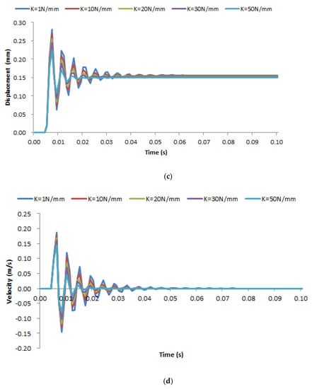 The velocity response characteristics with spring stiffness of 1 N/mm~50 N/mm are shown in Figure 13d. The velocity before 0.004 s is 0 m/s, and the maximum velocity overshoot is reached at 0.006 s. The velocity corresponding to different spring stiffness values oscillates and the oscillation frequency is about 250 Hz. After a certain oscillation, the velocity will eventually reach the stable value of 0 m/s. The maximum velocity overshoots corresponding to spring stiffness of 1 N/mm, 10 N/mm, 20 N/mm, 30 N/mm and 50 N/mm are 0.187 m/s, 0.178 m/s, 0.169 m/s, 0.16 m/s and 0.144 m/s, respectively. When the spring stiffness is 1 N/mm, the number of oscillations is the maximum and the time to reach the stable velocity value is the longest. When the spring stiffness is 50 N/mm, the number of oscillations to reach the stable velocity value is the lowest and the time required is the shortest.