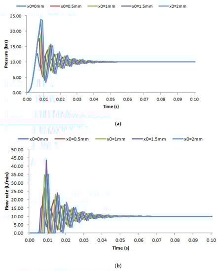 The flowrate response characteristics of a valve element with a diameter of 10 mm~15 mm are shown in Figure 15b. The flowrate before 0.004 s is 0 L/min, and the flowrate corresponding to different valve element diameters oscillates. After a certain oscillation, the flowrate finally reaches the stable value of 10 L/min. With the increase in valve element diameter, the flowrate oscillation frequency increases and the flowrate oscillation amplitude decreases.