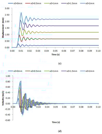 The displacement response characteristics with a spring stiffness of 1 N/mm~50 N/mm are shown in Figure 13c. The displacement before 0.004 s is 0 mm, and the maximum displacement overshoot is reached at 0.007 s. The displacement corresponding to different spring stiffness values oscillates and the oscillation frequency is about 250 Hz. After a certain oscillation, the displacement will eventually reach the stable value. The displacement stability values corresponding to a spring stiffness of 1 N/mm, 10 N/mm, 20 N/mm, 30 N/mm and 50 N/mm are 0.156 mm, 0.155 mm, 0.153 mm, 0.152 mm and 0.149 mm, respectively, and the corresponding maximum displacement overshoots are 0.125 mm, 0.114 mm, 0.103 mm, 0.093 mm and 0.076 mm, respectively. When the spring stiffness is 1 N/mm, the number of oscillations is the maximum and the time to reach the stable displacement value is the longest. When the spring stiffness is 50 N/mm, the number of oscillations to reach the stable displacement value is the lowest and the time required is the shortest.