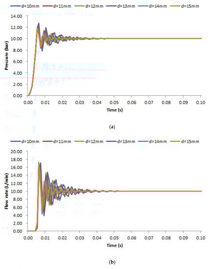 The pressure response characteristics of a valve element with a diameter of 10 mm~15 mm are shown in Figure 15a. The pressure corresponding to different valve element diameters oscillates, and the pressure finally reaches its stable value after a certain oscillation. With the increase in valve element diameter, the pressure stability value decreases. The pressure stability values corresponding to the valve element diameters of 10 mm, 11 mm, 12 mm, 13 mm, 14 mm and 15 mm are 10.02 bar, 10.015 bar, 10.011 bar, 10.009 bar, 10.007 bar and 10.006 bar, respectively. In addition, it is easy to see that with the increase in valve element diameter, the pressure oscillation frequency increases and the pressure oscillation amplitude decreases.
