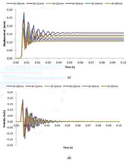 The velocity response characteristics of a valve element with a diameter of 10 mm~15 mm are shown in Figure 15d. The velocity before 0.004 s is 0 m/s. The velocity corresponding to different valve element diameters oscillates. After a certain oscillation, the velocity finally reaches the stable value of 0 m/s. With the increase in valve element diameter, the frequency of velocity oscillation increases while the amplitude of oscillation decreases, and the time for the velocity to reach the stable value also decreases.