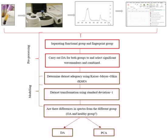 About 15 OA serum samples and 10 control serum samples were scanned 10 times for each formulation using an ABB MB3000 ATR-FTIR spectrometer (Clairet Scientific, Northampton, UK) equipped with a diamond crystal of ATR GladiATR platform (Perkin Elmer, MA, US). An amount of 1–2 g of samples was put in touch with the diamond crystal at 20 °C. The scanning was carried out in the mid-infrared range of 450 cm−1 to 4000 cm−1 at 4 cm−1 resolution. A total of 250 produced absorbance spectra were pre-processed using Horizon MB ATR-FTIR software version 3.0.13.1 (ABB, Montreal, QC, Canada) to facilitate the differentiation process among the samples. All spectra were subjected to baseline and smooth corrections to obtain a better spectrum. The spectra were analysed for chemo metrics analysis as shown in the Figure 1.