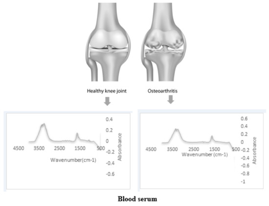 When the whole joint is affected by OA, it results in molecular and macroscopic changes within the articular cartilage, synovium, subchondral bone, ligaments, meniscus, and synovial fluid [20]. Identifying OA at its early stages may represent a critical clinical window for effective intervention strategies. However, currently, there are no sensitive biomarkers for early-stage OA, and the clinical diagnosis is mainly made at the later stages. Thus, serum research is crucial to understand the serum metabolomics network indicating ageing in OA pathogenesis and determining the variation of biomarkers’ potential diagnostic utility [21,22]. In this study, we investigated the capability of infrared spectroscopy to classify the sera from patients with OA and controls.