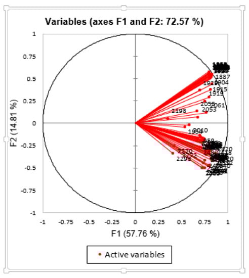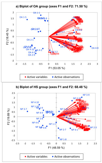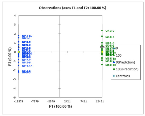 Besides performing DA from ATR-FTIR spectral data derived from OA and healthy serum in the present study, PCA was also conducted and it is one of the unsupervised pattern recognition techniques used in multivariate analysis. The reason of conducting PCA is to simplifies the complexity in high-dimensional data and showing the trends or patterns between OA and control groups. Moreover, PCA projects the original data in reduced dimensions defined by the PCs. This technique is useful when there is a correlation between data [44]. In this study, PCA was accomplished using ATR- FTIR spectra wavelength of blood serum from OA and healthy groups at the frequency region of 3994–509 cm−1 after the data were transformed. The OAHS model had two formulas (Formula (1) and (2)), which explained the observation/variables value of 72.57% (Figure 3) for the whole dataset. This observation/variables value indicated that the OAHS model could explain the dataset very well as the CV value was greater than 70% [45]. The ATR-FTIR analysis supported the significant wavelengths from the PCA results, which demonstrated peaking at the wavelengths of 2019–2015 cm−1, 1745–1740cm−1, 1456–1453 cm−1, and 1152–1145 cm−1. Additionally, PCA highlighted the overall significant wavelength from the ATR-FTIR data, describe the correlation and distribution of significant wavelength as identified by the DA in OAHS model as well as demonstrated pattern classification between groups (Figure 4).
