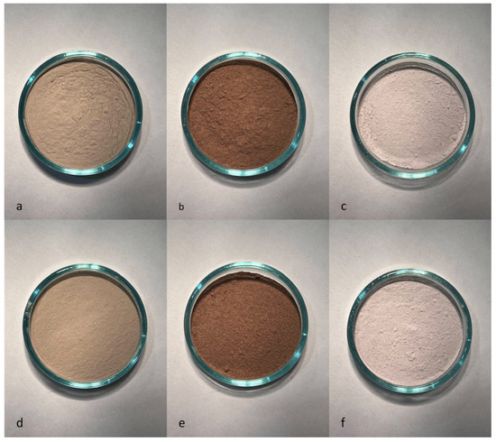 Ground 38 µm (a) olive pomace, (b) walnut, and (c) mussel powders and ground 45 µm (d) olive pomace, (e) walnut, and (f) mussel powders.