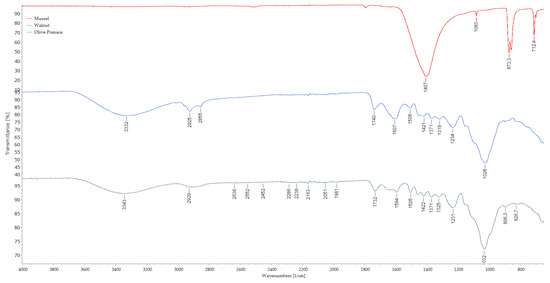 FTIR spectroscopy of organic powders (mussel, walnut, and olive pomace).