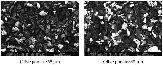 Three different types of powders, namely mussels, olive pomace, and walnut powders, in two different sizes of 38 µm and 45 µm were used as additives. The grinded powders of 38 µm and 45 µm are given in Figure 1 as olive pomace, walnut, and mussel, respectively. For mussel powders, waste mytilus galloprovincialis shells were used. A hardness of 3.5 Mohs to 4.0 Mohs is acceptable for mussel shells [32].