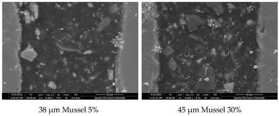 In the visual examination of the powders, there was no difference other than color separation. However, it was seen that there were significant differences when SEM images were taken. Mussel powders are brittle, olive pomace powders are round, and walnut powders have a fringed fractured surface. When the SEM images in Figure 5, taken from the joints where 38 µm olive pomace was added in the ratio of 30% by weight, are examined, it is seen that there is a large void where the olive pomace added adhesive contacts the lower and upper surfaces of the base metal. This void is also seen along the joint interface. Therefore, it is understood that adhesion is not fully realized. Moreover, it is understood that the void spreads over the base metal surface into the bonding zone. Mixing the adhesive and the 38 µm olive pomace with each other at this rate reduced the adhesion effect of the adhesive.