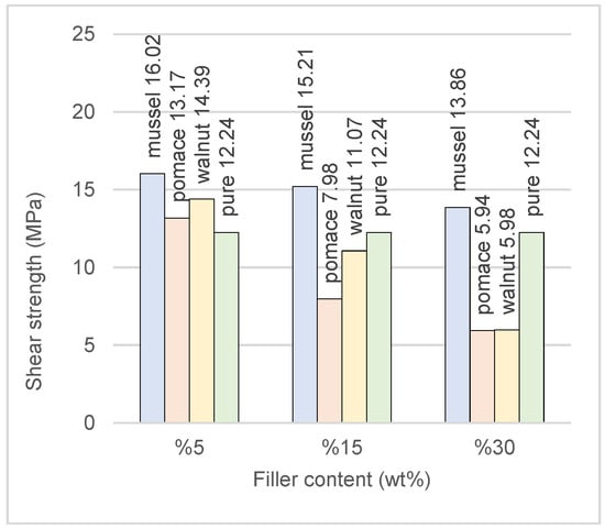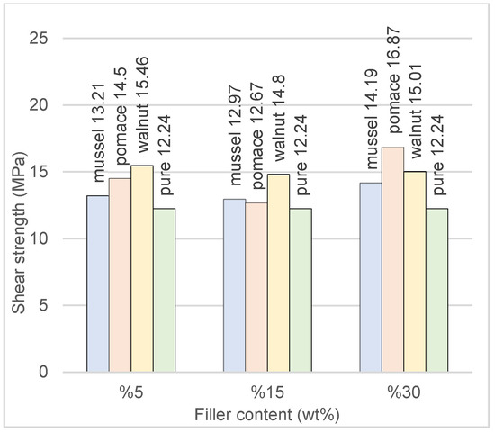 The tensile tests were carried out for the bonded test samples. The tensile test graphs are given in Figure 6 and Figure 7. The average shear strength of the bonded joint obtained using pure adhesive was found as 12.24 N/mm2. It is known that the bond strength decreases when the amount of powder added to the pure adhesive is higher than a certain amount (threshold value). In the studies verifying this statement, metal powders are generally used as the additives [44]. The results of the experiments performed using olive pomace, walnuts, and mussels with a size of 38 µm are consistent with the literature. On the other hand, when the powder size increases to 45 µm, there is an effect of increasing-decreasing-increasing strength as the amount of additive increases. Accordingly, it is understood that there is a threshold value for the amount of powder added to the adhesive.