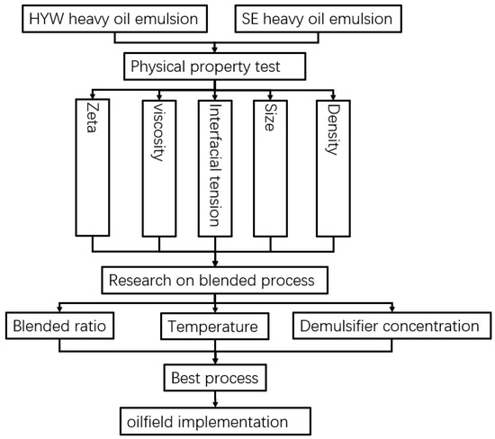Firstly, the viscosity temperature curves at different blended ratios are measured by using Physica MCR301 rheometer. The temperature was 40 °C, 50 °C, 60 °C, 70 °C, 80 °C, 90 °C, and the rotational speed was 1 s−1. Secondly, the size and type of emulsion are measured using Zeiss AXIOSKOP 40 microscope. The emulsion density is measured by XFCNMD-320API. The emulsion interfacial tension is measured with TX500C interfacial tensiometer, with the rotating speed of 6000 rpm and temperature of 70 °C. Zeta potential of emulsion is measured with Malvern zetasizer nano at 70 °C. The blended ratio is 10:0, 9:1, 8:2, 7:3, 6:4, 5:5, 4:6, 3:7 and 0:10 respectively. The test process is shown in Figure 1.