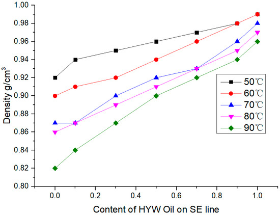 The density of HYW and SE emulsion was measured with a densimeter. As shown in Figure 3, the density of HYW emulsion was 0.99 g/cm3, while that of SE emulsion was 0.92 g/cm3. The higher the content of HYW emulsion, the greater the density; the higher the temperature, the lower the density. There are two main reasons: first, after the temperature rises, part of the emulsion begins to break. Under the action of gravity, the water with high density sinks, and the oil with low density floats, resulting in the decrease of the density of the water-in-oil emulsion. Second, the liquid has the characteristics of thermal expansion and contraction. When the temperature increases, the volume increases and the density decreases.