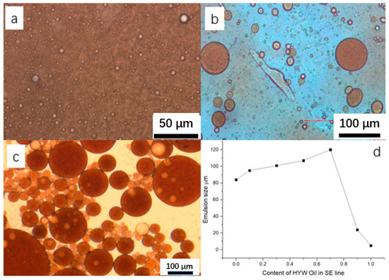 (a). The optical photos of HYW emulsion; (b). SE emulsion; (c). HYW mixed with 70% emulsion; (d). Size distribution of different emulsions.